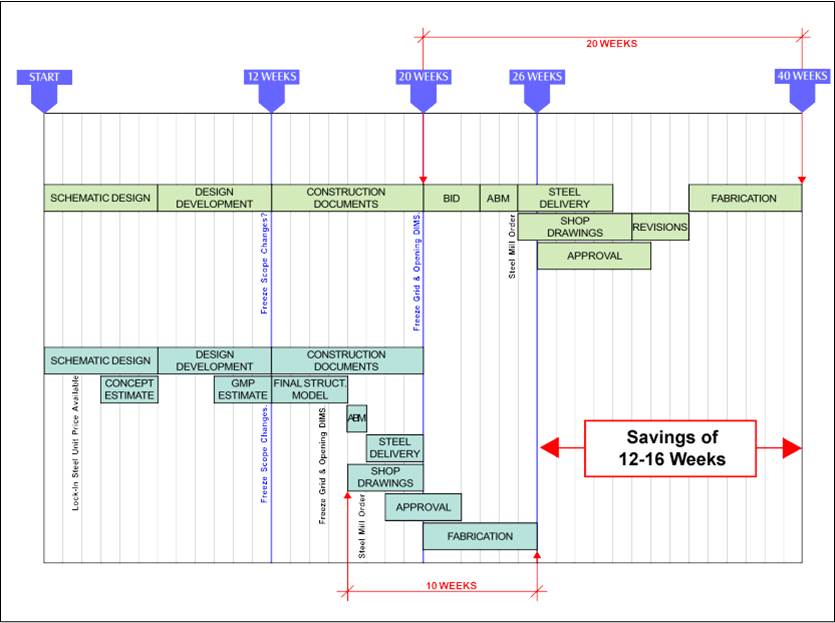 Coordination of the activities of the structural engineer and steel fabricator can result in significant schedule savings beyond what would normally be anticipated on a steel-framed project. AISC has documented projects in which early fabricator involvement has reduced the schedule requirements of the steel portion of the project by as much as 30%. And the steel framing system is always on the critical path of the project.