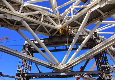 AISC’s Mid-Atlantic Regional Engineer, Jacinda Collins, P.E., LEED Green Assoc., recently visited the U.S. Tennis Association Arthur Ashe Stadium in Flushing Meadows–Corona Park, Queens, N.Y., for a tour of the new retractable steel roof being constructed over the stadium. The initial roof frame is expected to be finished by June (in time for this year’s U.S. Open August 31 - September 13). The remaining construction work will resume in the fall, with the retractable portion of the roof to be installed later this year. Twenty-five steel columns will support the roof of the stadium – each 150 ft high, all in blue to match the color of the U.S. Open courts. Several facilities are contributing the fabricated structural steel for the project, including AISC-Member/AISC-Certified fabricators Canam Steel Corporation, PKM Steel Service, Inc., and ADF International, Inc. Derr Steel Erection Co. (an AISC Member/AISC Advanced Certified Steel Erector) is the steel erector for the project. Completion for the project is slated for the 2016 U.S. Open. Click here to view a video of the construction project.