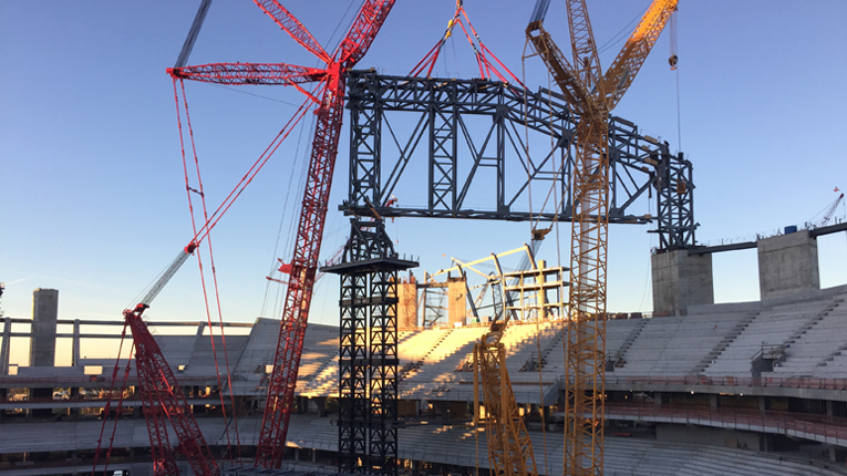 Large steel trusses are rising for the retractable roof of the new Mercedes-Benz Stadium, future home to the Atlanta Falcons of the National Football League and Atlanta United FC of Major League Soccer.