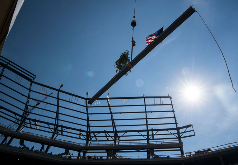 The 33-ft-long beam, which also had an American flag and a tree mounted on it — an American Ironworkers tradition dating back to the 1930s — was placed 155 ft above the park’s yet-to-be completed playing surface, putting a cap on the approximately 6,800 tons of steel used on the project. Laid end-to-end, the steel would stretch for 50 miles. Hirschfeld Industries (an AISC Member and Certified fabricator) is the project’s steel fabricator.