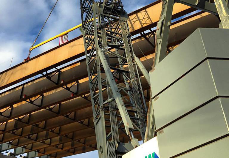 Recent drone and aerial footage shows the progress being made for the East End Crossing of the Ohio River Bridges Project between Kentucky and Indiana. Workers are installing the structural steel for the main span of the 2,500-ft-long, cable-stayed bridge, which will connect Louisville with Utica, Ind., over the Ohio River. The project, which uses about 6,700 tons of structural steel, is roughly 80% complete and will open to traffic late this year. The bridge will include two lanes in each direction and a 13-ft-wide pedestrian and bicycle path.