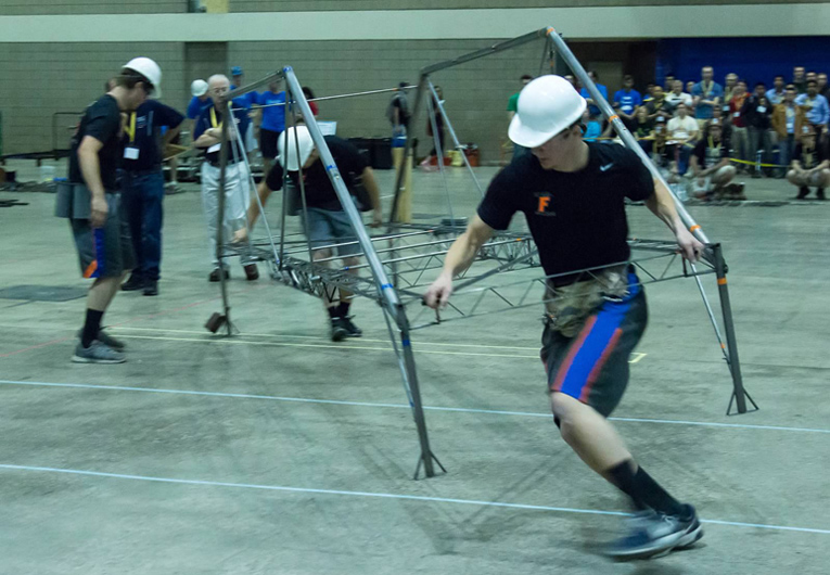 The competition is an exciting visual display of students’ structural design and analysis skills at work. Teams are challenged to design, fabricate and construct their own one-tenth-scale steel bridge in the shortest time and under specific building constraints that reflect real-life structural specifications and construction regulations. Bridge rankings are based on a variety of factors including construction cost, construction speed, total bridge weight and bridge stiffness.