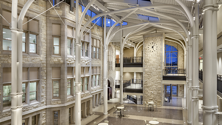 Now, more than a century after it was built, it has undergone another, 43,000-sq.-ft addition. Designed by Wight & Company (Wight), the new structure features a three-story glass curtain wall façade that leads into a bright and inviting student center atrium. Beyond that is a spacious, open-plan dining pavilion, also steel-framed, that can seat up to 600 people for events. The focal point of the addition is a soaring structure of hollow structural sections (HSS) that defines a collaborative space for the school’s 2,600 students, where they can study, socialize and access student services.