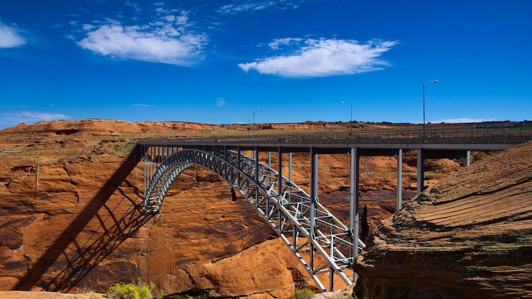 The steel arch Glen Canyon Bridge carries U.S. Route 89 across the Colorado River in Page, Ariz., just 865 ft downstream from the Glen Canyon Dam. It was built to aid in the construction of the dam and was later transferred to the state of Arizona. With a deck 700 ft above the river, Glen Canyon Bridge was the highest arch bridge in the world when it was completed in 1959.