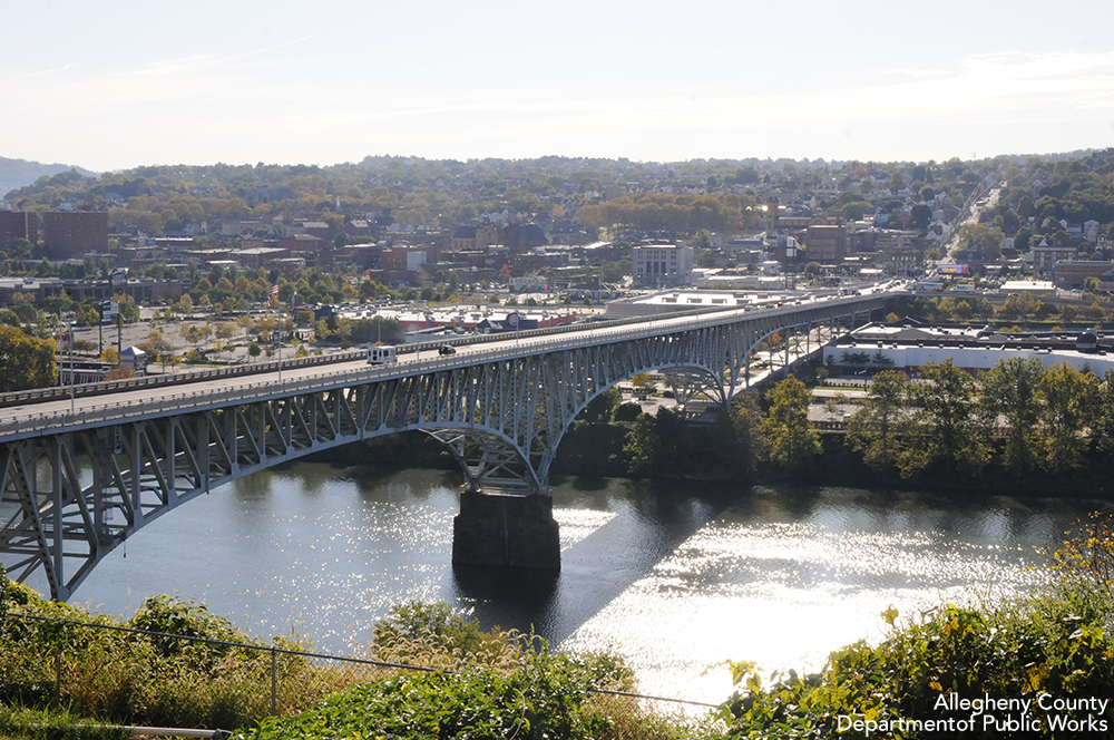 Opened in 1937, this impressive steel superstructure, originally known as the Homestead High-Level Bridge, was designed by Allegheny County with George S. Richardson as chief engineer. American Bridge Company constructed it. The total length of the bridge is approximately 3,100 ft, and it was designed to carry four traffic lanes and a pedestrian walkway on each side. Additionally, the bridge was designed to carry trolley traffic on rails placed in the center two lanes.