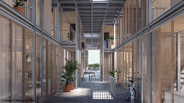 Public space is central to their plan to build community. Their design would open up the first floor of the existing building to create a porous space that welcomes residents and those from the surrounding areas. Even the corridors are designed to create a village-like atmosphere. The "Common Sky" area between the new and old units would serve as a focal point for people to gather, with a library and cafe. A roof terrace with modular steel trays provides space for an urban farm, as well.