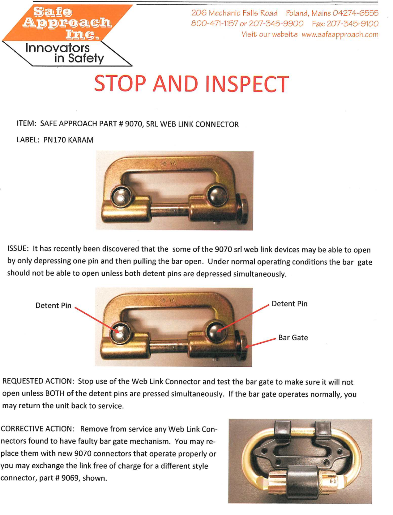Safe Approach has issued a stop and inspect notice for Part #9070, which is an SRL web link connector. Some devices may open when only one detent pin is depressed, instead of only opening when both detent pins are depressed simultaneously.