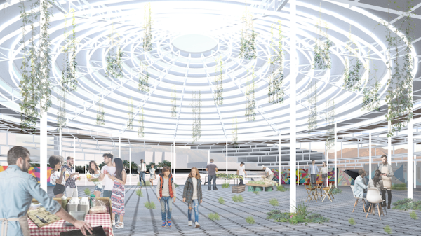 Mert Kansu and Yimeng Teng of VMDO Architects proposed a civic mixed-use plaza in Richmond, Va., that focuses on public engagement, community programs, and sustainability. Their design incorporates steel plates to create an expressive folding form.