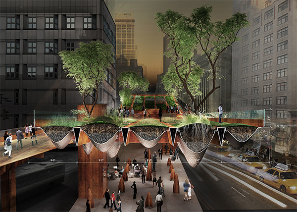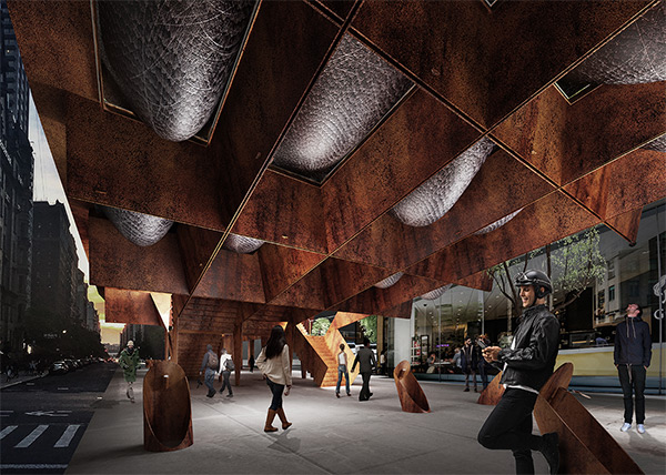 The Footbridge concept, intended for a site in Manhattan that connects to the existing High Line, marries the raw look of weathering steel with the shine of hammered stainless steel planters that hold trees and other vegetation. Stormwater runoff would drip into bespoke weathering steel bollards on the plaza below, creating an immersive visual and auditory effect in inclement weather.